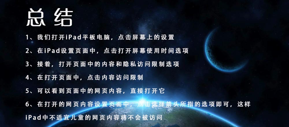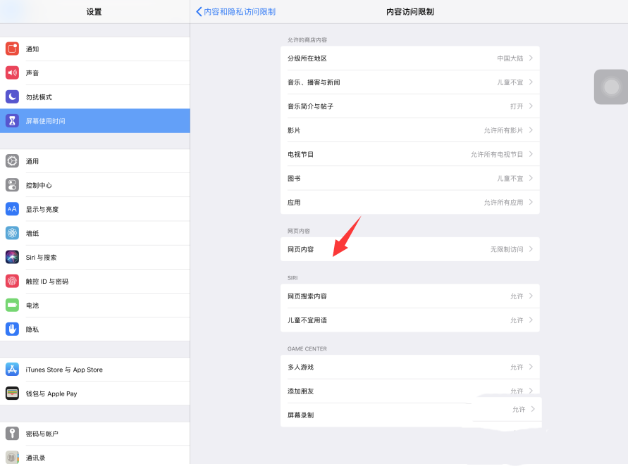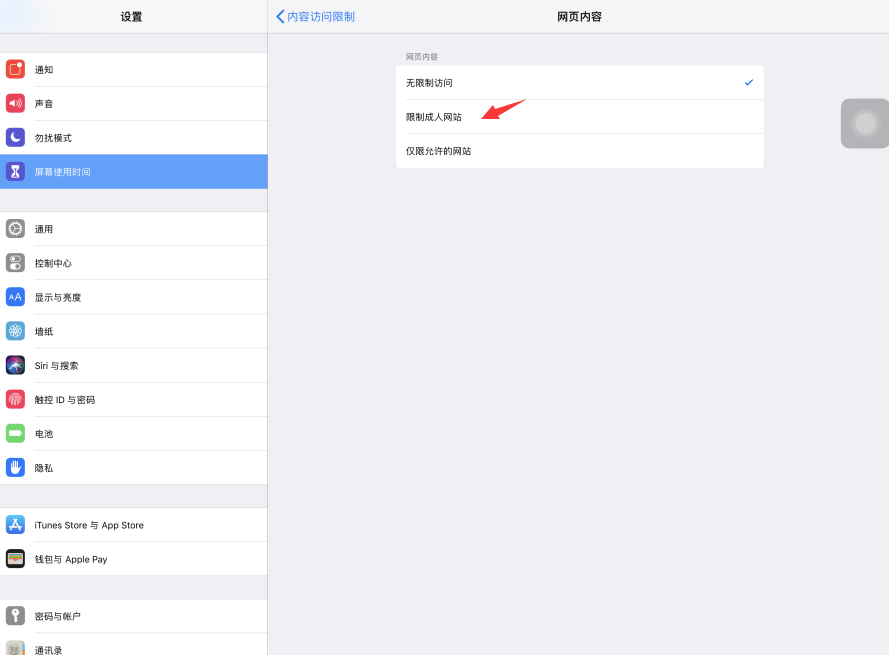 6、在打開的網頁內容設置頁面中,點擊選擇箭頭所指的選項即可,這樣iPad中不適宜兒童的網頁內容將不會被訪問
