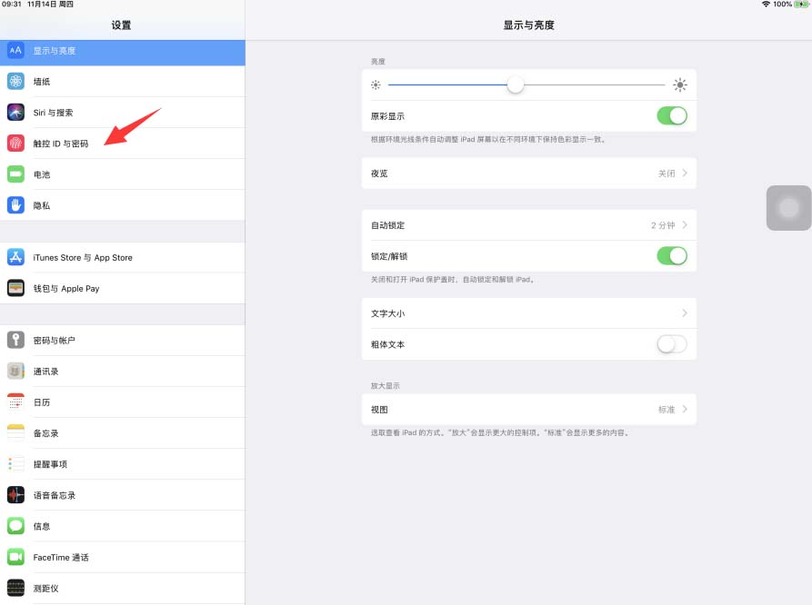 2、進入設置頁面,點擊打開觸控ID與密碼選項