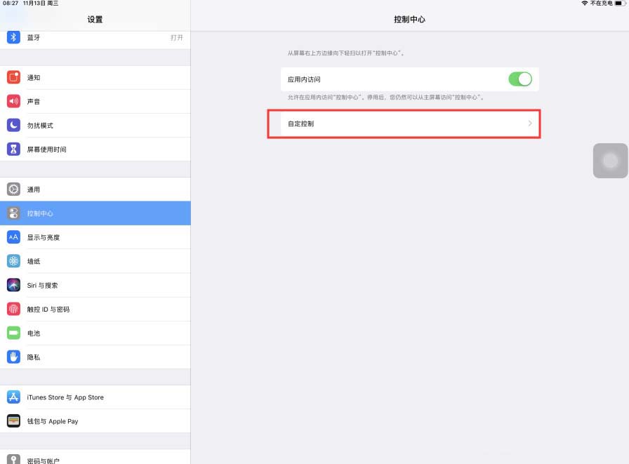 3、進入iPad控制中心設置頁面,點擊自定控制選項