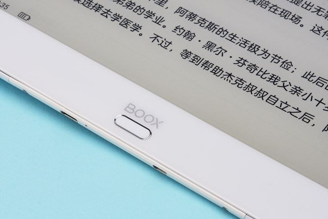 在機身面板的正面,BOOX MAX3集成了一枚實體按鍵,方形的按鍵與機器的整體風格十分相似,而在功能方面,除了擁有最基本的短按返回,長按回到主頁等快捷功能外,這枚按鍵還支持指紋識別功能,根據官方給出的資料顯示其可以實現最快0.5s的快速解鎖,進一步滿足用戶的使用需求。