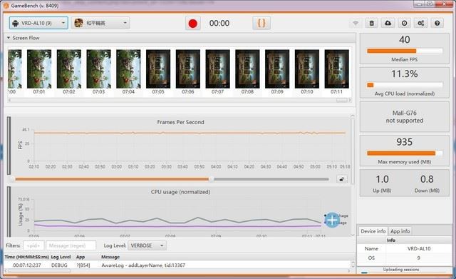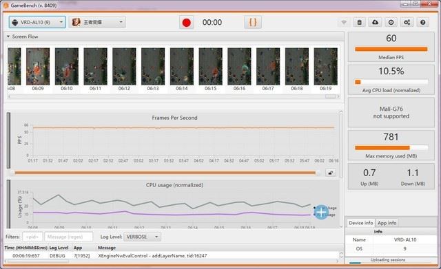 對于王者榮耀我們采用了gamebench來測試幀率。將畫面和幀率也相應地調至最高,從結果來看,有游戲幀率基本穩定在60幀,全程沒有太大波動。