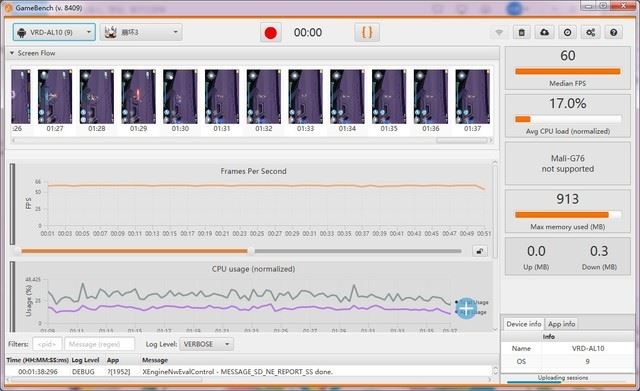 通過gamebench的測試,平均幀率結果為60幀,幀率平穩全程沒有掉幀的現象,可見哪怕是針對這樣對GPU要求很高的大型游戲,華為平板M6高能版也能輕松應對。