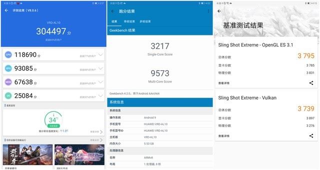 為了測試華為平板M6高能版麒麟980的性能表現,我們使用了安兔兔,geekbench和3D Mark來測試。從跑分結果來看,安兔兔跑分304497分,geekbench 單核3217分,雙核9573分,3DMark OpenGLES 3.1接口成績為3795,Vulkan接口成績為3739,這個成績對于玩游戲來說,是很優秀的了。這個成績也足夠流暢運行很多大型游戲了,可見華為平板M6高能版的性能還是不錯的。