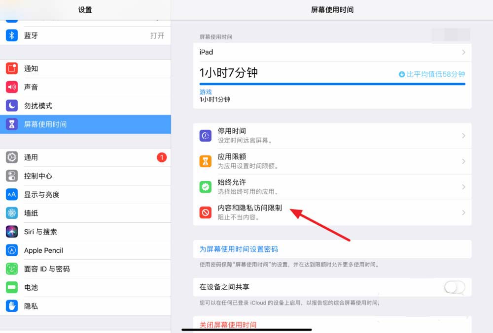 3、接著找到屏幕使用時間下的內容和隱私訪問限制
