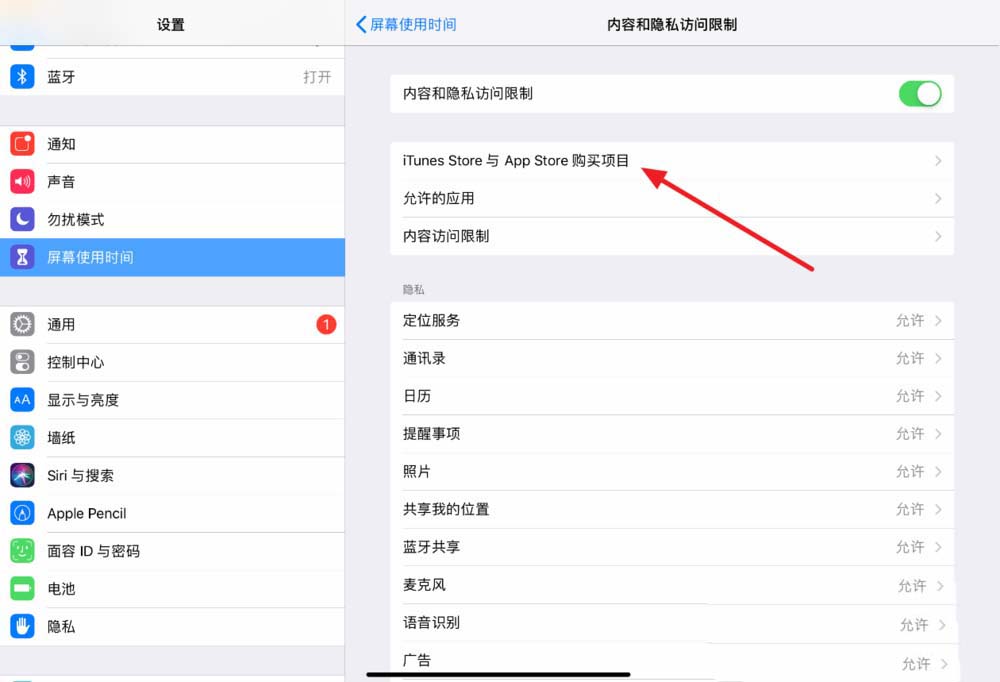 4、進入后,可以直接關閉內容和隱私訪問限制,如果只想關閉禁止刪除APP的功能,選擇iTunes Store與App Store購買項目
