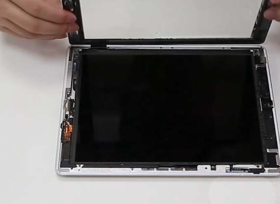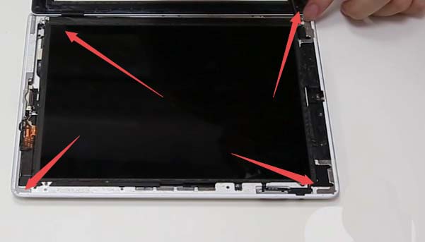 6、然后用四角螺絲刀擰下內屏四周的螺絲,然后慢慢代開ipad內屏