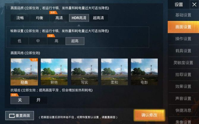 我們采用了目前非常火爆的《和平精英》進行測試,將畫面設(shè)置為HDR高清,幀數(shù)設(shè)置為超高進行測試。