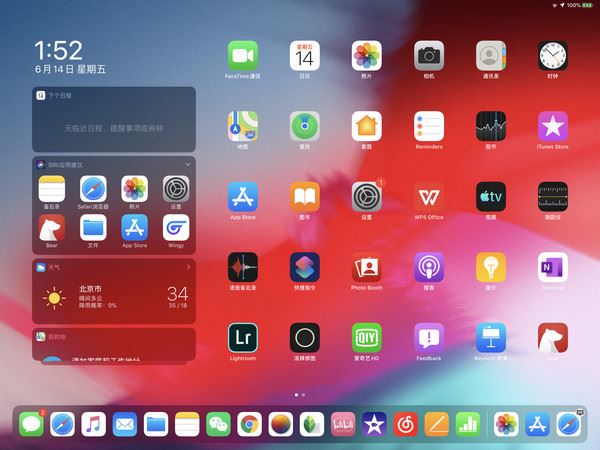 iPadOS的首頁也有升級(jí),原有的負(fù)一屏被改為在桌面左側(cè)顯示的“今天”視圖,我們可以在該視圖中放置常用的Widget,例如日程、Siri應(yīng)用建議、天氣、電池電量等。