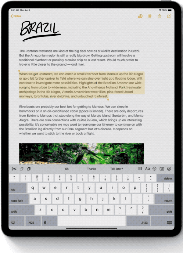 除了復(fù)制粘貼等手勢(shì)外,iPadOS內(nèi)置的文字快速選擇手勢(shì)同樣十分方便。在一段文字中我們可以通過雙擊進(jìn)行選詞、三次點(diǎn)擊選整句或者四次點(diǎn)擊選擇整個(gè)段落,再配上上述的復(fù)制粘貼手勢(shì),即使不用鼠標(biāo)鍵盤,也你能快速完成輸入。