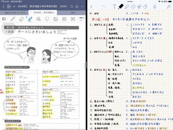 還有一個(gè)使用場(chǎng)景就是左邊放GoodNotes的PDF書(shū),右邊用Notability做筆記(下圖)。