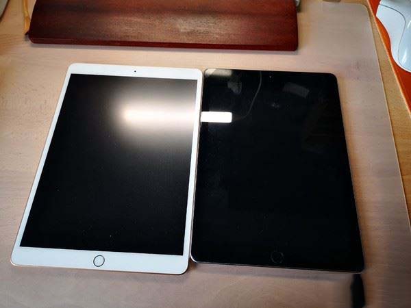 點(diǎn)亮屏幕,可見(jiàn)10.5顯示區(qū)域看著大一些,也舒服一些,左右邊框窄一些看著也挺舒服的。拍這張屏幕照的時(shí)候已經(jīng)貼膜,左邊air是類紙模,右邊2018是高清膜。