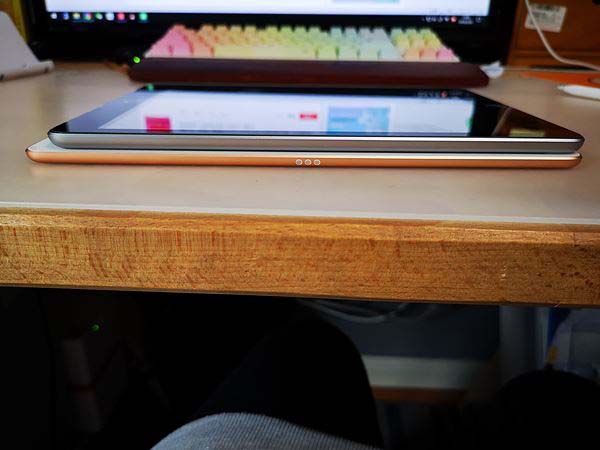總的來(lái)說(shuō),ipad air3 比 ipad 2018輕了一點(diǎn)點(diǎn)(大概13g的樣子),也薄了一點(diǎn)點(diǎn)(大概1.4mm),但是在貼膜和上保護(hù)套之后,差距可以徹底無(wú)視。