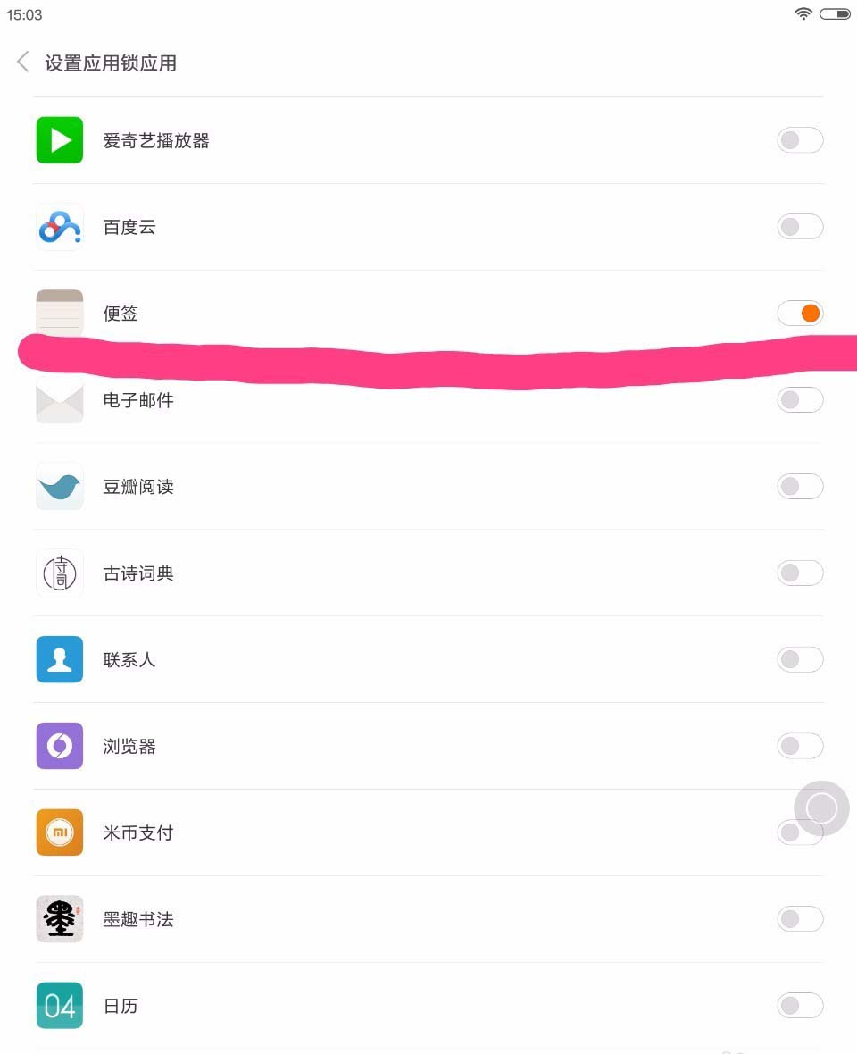 3、然后點擊下方的設置應用鎖應用,在打開的面板里選擇便簽,并打開便簽的開關,此時我們就為便簽加上了密碼。