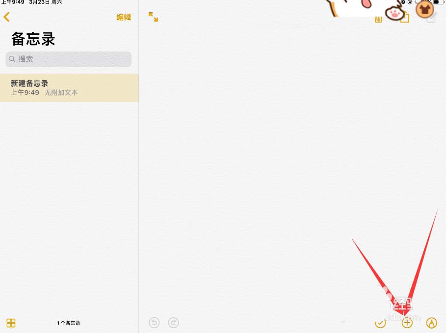 3、新建的備忘錄就會(huì)在界面中跳出。我們仔細(xì)觀察界面,找到最下面一排倒數(shù)第2個(gè)圓形的加號(hào)圖標(biāo)。手指點(diǎn)擊它。