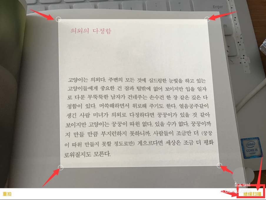 6、系統(tǒng)會(huì)自動(dòng)辨識(shí)內(nèi)容。我們可以手動(dòng)拖動(dòng)角上的圓圈來調(diào)整掃描的范圍。調(diào)整完成以后,點(diǎn)擊右下角的黃色圖標(biāo)繼續(xù)掃描。