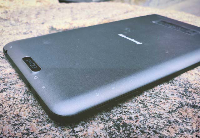 值得一提是,中柏EZPad Mini5機身背部材質比較特殊,采用質感很贊的拉絲工藝處理,手摸上去有明顯紋路覺。在單手握持的時候可以增加摩擦力,減少了意外滑落的幾率。此外,在機身背部頂端中間并不是后置攝像頭,而是中柏EZPad系列標識,下面是揚聲器開孔區域。