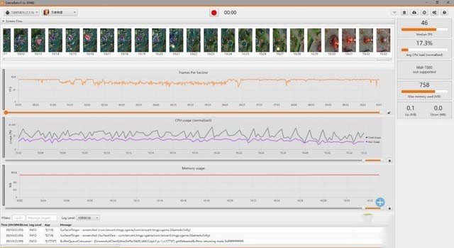在開啟《王者榮耀》默認(rèn)畫質(zhì)的前提下,我們使用了Gamebench來記錄它的幀率表現(xiàn),在十分鐘的游戲過程中,它的平均幀率為46幀。