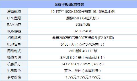 首先來看下配置部分,從版本上劃分,榮耀平板5分為WiFi版和LTE版,前者只支持WiFi無線網絡,后者不僅支持WiFi,還可以安裝SIM卡,支持4G網絡,方便隨時隨地上網,以下是具體的參數部分。