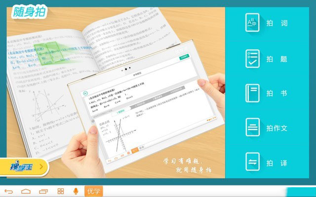 遇到作業難題?用優學派隨身拍就能解決!拍題、拍字詞、拍書、拍作文、拍譯,五大隨身拍功能很強大。比如遇到數學難題,孩子可點擊“拍題”進入,整頁拍,點題搜,不僅能獲得清晰的解析,更能反鏈書本原文知識點,讓孩子學會一題,更會一類題,從根本上解決作業難題。