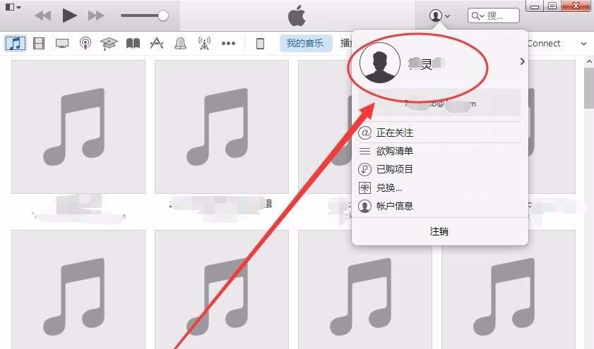 3、打開(kāi)iTunes后,右上方會(huì)有蘋(píng)果機(jī)的帳號(hào),說(shuō)明蘋(píng)果機(jī)已連接上iTunes。