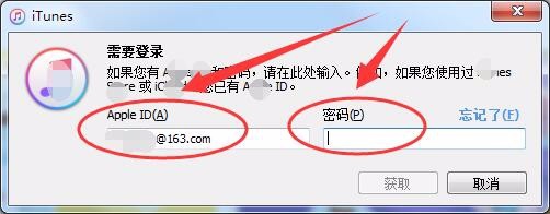 8、在出現(xiàn)的對(duì)話框中,輸入本蘋(píng)果機(jī)的帳號(hào)和密碼,單擊獲取按鈕。