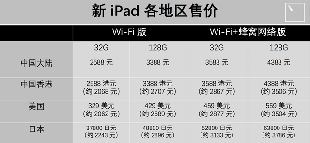 我們知道對(duì)于蘋果產(chǎn)品是根據(jù)不同國家或地區(qū)價(jià)格有所不同,但我們已經(jīng)知道了中國大陸、中國香港、美國、日本等國家及地區(qū)已經(jīng)成為了首發(fā)地區(qū)。下面來看看不同國家或地區(qū)新款iPad的價(jià)格情況。