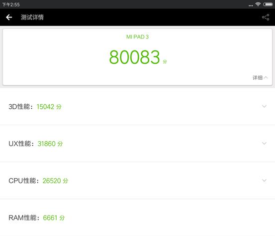 在跑分方面,本次小米平板3搭載的MT8176在安兔兔測試中跑出了8萬的分?jǐn)?shù),與驍龍652平臺(tái)的跑分接近,而相較于小米平板2的5萬+的成績有很大的提升。這樣的分?jǐn)?shù)并不算高,但實(shí)際操作體驗(yàn)中它的表現(xiàn)令人滿意,沒有出現(xiàn)卡頓;而且即使在跑分這樣的壓力測試下,小米平板3的發(fā)熱控制的仍然很好,和跑分之前并無大異。