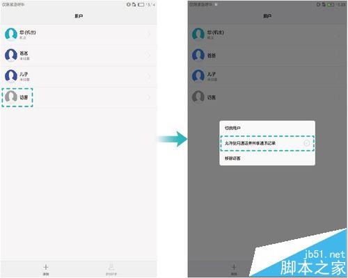 4、授權(quán)用戶使用電話、信息及共享通訊記錄,以機(jī)主身份登錄時(shí),可以對(duì)子用戶及訪客進(jìn)行授權(quán)。點(diǎn)擊要授權(quán)的用戶,在彈出的菜單中點(diǎn)擊允許使用通話和信息并共享通訊記錄。獲得授權(quán)后,該用戶可以使用電話和短信功能,還可以與主機(jī)共享通話記錄和短信。如果機(jī)主對(duì)多個(gè)子用戶進(jìn)行授權(quán),被授權(quán)的子用戶之間也可以共享通話記錄和短信。