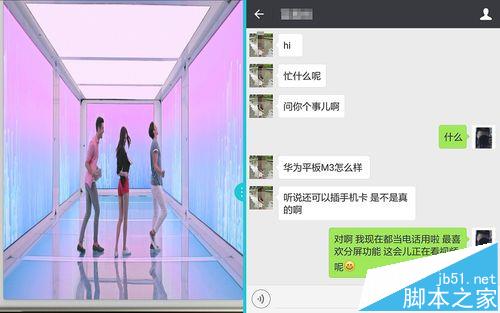 4、在多窗口選擇界面,屏幕被分為兩個窗口,每個窗口都可以打開一個應用程序。瞧,小編分別打開視頻和和圖片,同時看視頻和聊天哦。