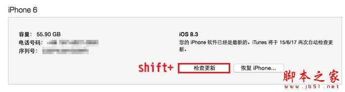 4、然后按住鍵盤上的 Shift(Option),同時(shí)鼠標(biāo)點(diǎn)擊 iTunes 界面的【檢查更新】按鈕,再選擇對(duì)應(yīng)版本的 iOS 10固件進(jìn)行升級(jí)。