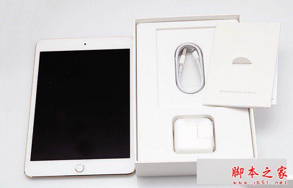 打開(kāi)簡(jiǎn)約白色的包裝盒,就可以見(jiàn)到iPad mini 4真機(jī)與配件了。配件主要包括數(shù)據(jù)線(xiàn)、充電器、三包憑證等,如下圖所示: