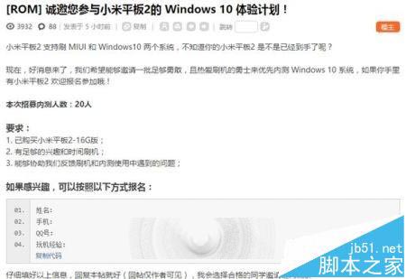 今天,小米在MIUI官方社區(qū)開始招募小米平板2的Windows 10系統(tǒng)體驗用戶,只要購買了小米平板2 16GB版的用戶都能申請,但只會招募20人。