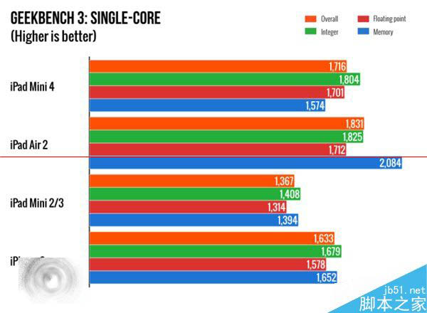 其它配置方面,數據顯示iPad mini 4搭載A8雙核處理器,主頻為1.5GHz,比iPad mini 2/3的1.3GHz A7處理器快了不少,甚至快過iPhone6的1.4GHz A8處理器。從單、多線程跑分來看,iPad mini 4的單線程跑分逼近iPad Air 2(三核A8X),已超過iPhone6。
