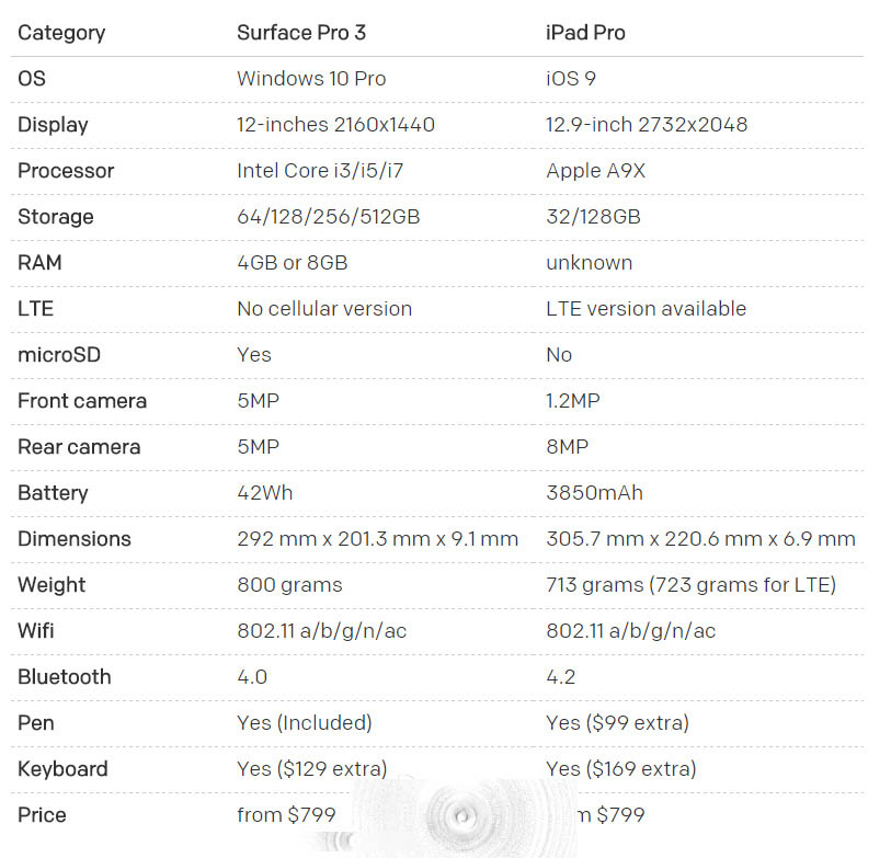 下面是Surface Pro 3與iPad Pro關鍵配置對比: