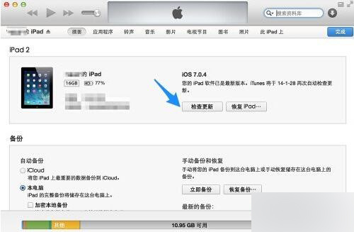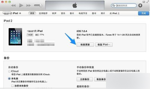 2、一般情況下,當 iTunes 檢測到有連接的設備之后,都會自動連網為它檢測是否當前有可用的更新系統,然后會自動彈出升級更新出來。如果沒有彈出來的話,那我還可以在 iPad 的摘要界面點擊“檢查更新”按鈕,如圖所示