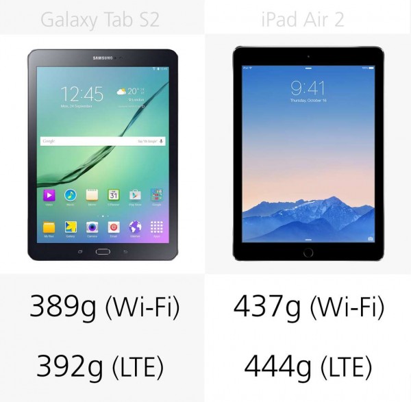 這無疑是Galaxy Tab S2的又一優勢。iPad Air 2可謂是相當的輕,在重量上分別比iPad Air 2輕11%(WiFi-Only)和12%(LTE版本)。
