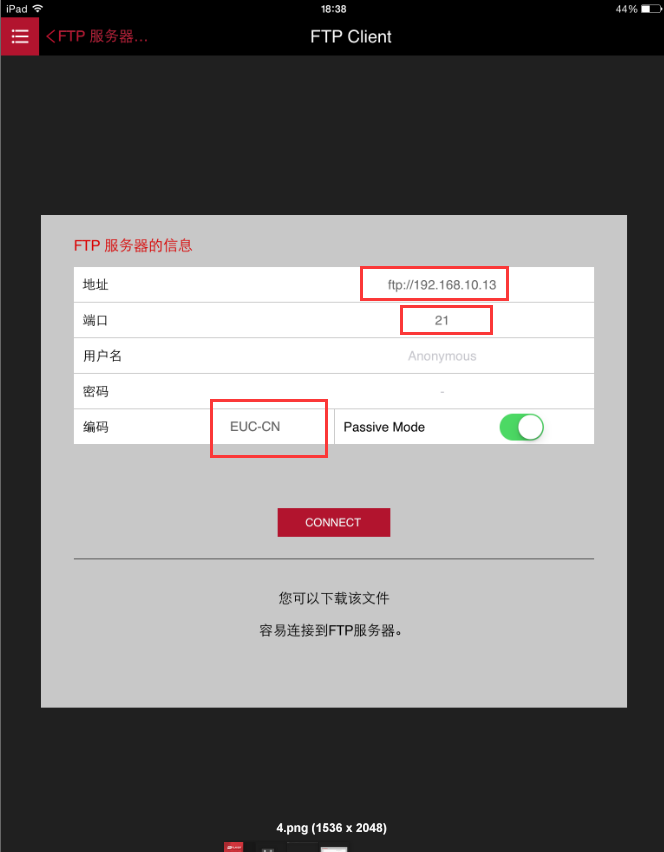 開AVPlayer里面的Wi-Fi TRANSFER,選擇FTP Client,輸入地址為搭建FTP服務里面的IP地址,