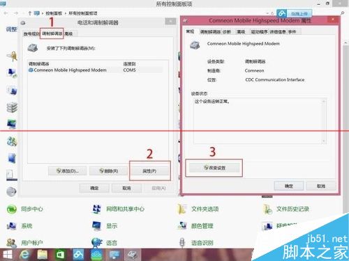 3、選擇電話和調制解調器首次啟動可能會需要填寫區號,比如青島是0532,北京是010,填一下點擊確定即可切到“調制解調器”選項卡點擊“屬性,點擊“改變設置