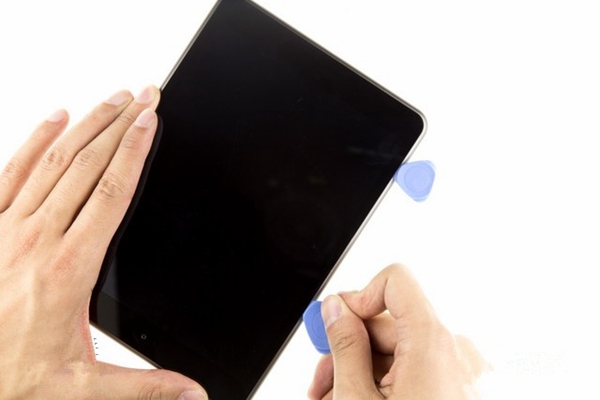 首先,利用一片翹片插入屏幕縫隙,并向上緩慢滑動翹片令縫隙擴大。為了防止已經開口的屏幕重新與機身粘接,我們需要新的翹片沿著另一個方向繼續擴大縫隙,直到將屏幕與機身全部分離。