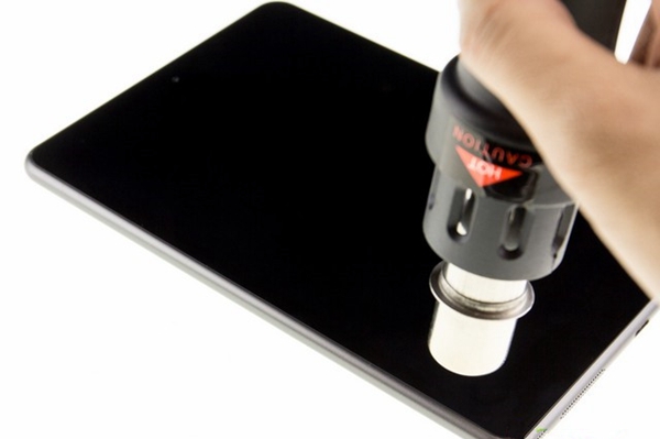 我們先用熱風槍加熱屏幕長邊中間的位置,因為這里是最容易打開的部位。