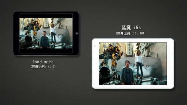 藍魔i9s的屏幕分辨率為1920*1200PPI為254。屏幕比例為16:10,我們都知道在IPAD或者小米平板上采用的都是4:3的寬屏,定義屏幕尺寸的的大小是以屏幕對角線的長度為準,所以用同樣尺寸對角線的4:3和16:10的屏幕來對比,可視面積方面4:3要更大于16:10。但在實際使用方面如玩游戲看電影16:10反而更有優勢,主流的高清視頻片源一般為16:9,在藍魔i9s的屏幕上能夠全屏幕的播放,而在ipad或小米平板這種4:3比例的屏幕,由于片源要保證畫面的長寬比,所以實際顯示的面積會等比例縮小,會造成上下黑邊的存在。