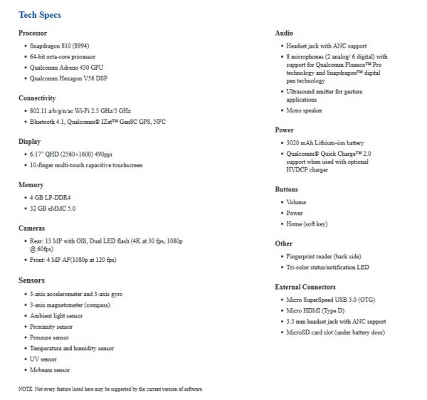 具體配置方面,這款驍龍810手機(jī)采用了6.17英寸2560×1600分辨率顯示屏,搭載驍龍810八核64位處理器(MSM8994),內(nèi)置4GB內(nèi)存和32GB機(jī)身存儲空間,提供一顆1300萬像素后置攝像頭和一顆400萬像素前置攝像頭,電池容量為3020mAh,支持高通快速充電2.0技術(shù)。