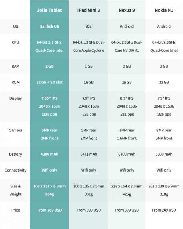 Jolla Tablet 采用 7.85 英寸 2048x1536 分辨率 IPS 屏幕,像素密度高達 330 PPI,搭載1.8GHz的英特爾 64 位四核處理器,2GB運行內存,32GB 內置存儲,支持 MicroSD 卡擴展,200萬像素前置攝像頭,500 萬像素主攝像頭,4300 mAh 電池,搭載 Sailfish OS 2.0 操作系統平板適配版本,兼容 Android 應用與游戲。機身三圍為 203x137x8.3mm,重量 384g。售價 189 美元(約合1150 元人民幣),需要到 2015 年 5 月發貨。