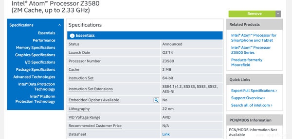 http://ark.intel.com/products/81195/Intel-Atom-Processor-Z3580-2M-Cache-up-to-2_33-GHz?wapkw=z3580