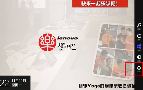另一個(gè)開關(guān)位置在超級(jí)菜單欄里,適合觸摸,從屏幕右側(cè)往左滑動(dòng),或者鼠標(biāo)移動(dòng)到右上角,:調(diào)出超級(jí)菜單欄,點(diǎn)設(shè)置,如圖: