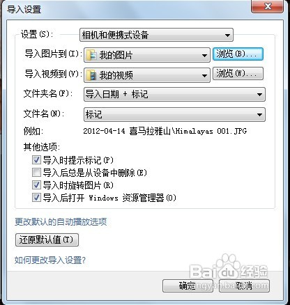 3)彈出【導入設置】窗口,可以設置您要導入圖片和視頻的存儲位置、標記名和其他一些選項,一般情況下我們不使用這個直接導入,這種導入會把您所有的ipad截圖和非同步存儲圖片以及視頻導入到您的電腦