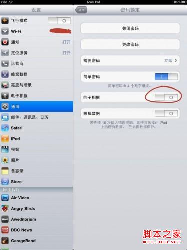 我們都知道在iPad處于鎖屏狀態(tài)的時(shí)候在解鎖滑塊的右邊有個(gè)快速打開(kāi)電子相框的按鈕。這個(gè)按鈕可以讓你不用解鎖iPad就可以用幻燈片的方式查看 iPad里面保存的照片。當(dāng)然,如果有時(shí)候你的照片庫(kù)里面存放了一些不太想讓別人看到的圖片(益牙:求求你,千萬(wàn)別往歪處想)的話(huà),你可不很不希望別人拿起你的iPad就可以看到。那么今天的這個(gè)小技巧就來(lái)告訴你如何去掉那個(gè)電子相框的按鈕(益牙:效果圖見(jiàn)上)。 設(shè)置起來(lái)其實(shí)很簡(jiǎn)單,只要打開(kāi)“ 設(shè)置 ”,在左邊選擇“ 通用 ”,右邊選擇“ 密碼設(shè)定 ”進(jìn)入選項(xiàng)設(shè)置。點(diǎn)擊最上面的“ 打開(kāi)密碼 ”之后系統(tǒng)會(huì)提示你輸入一個(gè)密碼。設(shè)定好密碼之后你就可以關(guān)閉下面的那個(gè)“ 電子相框 ”的功能了。參見(jiàn)下圖的示例。雖然繁瑣一點(diǎn)點(diǎn),但是為了不暴露自己的“小秘密”,也是可行的辦法之一。