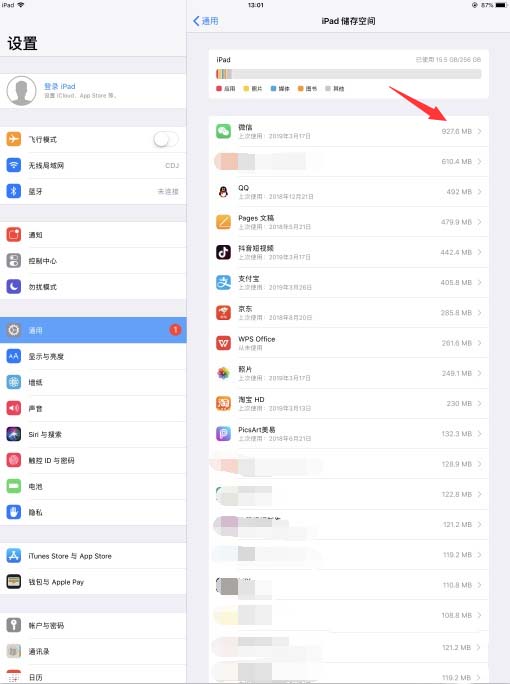 2、進(jìn)入到iPad設(shè)置頁(yè)面,點(diǎn)擊【通用】,在右側(cè)頁(yè)面中選擇【iPad儲(chǔ)存空間】