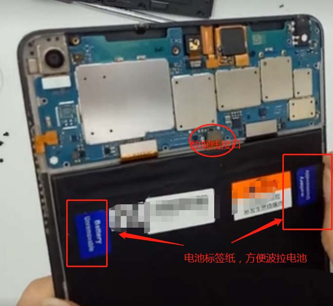 7、然后撥掉上方的電池排線接口,再找到電池背后的兩個標簽,撕開,方便拉出電池,如圖所示: