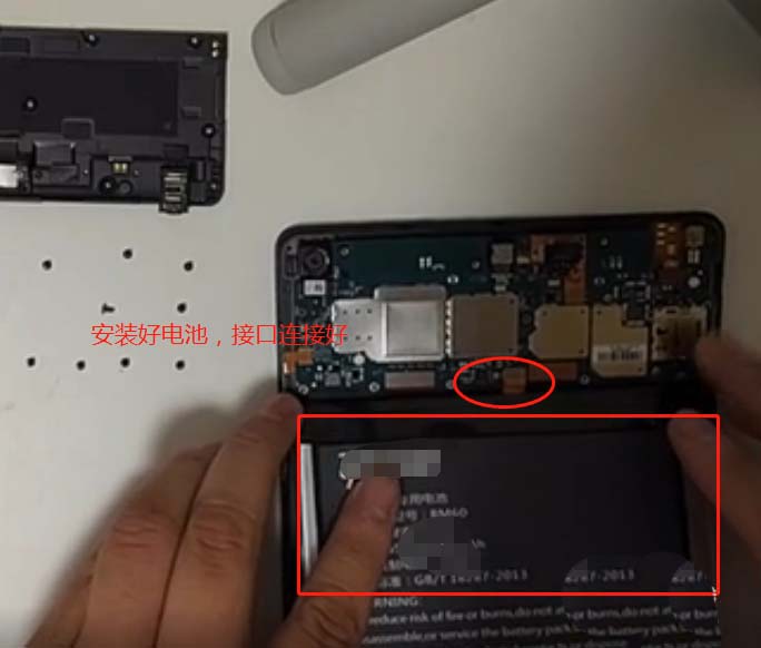 9、拆下來之后,再將新買的電池背面貼好膠布平穩放在平板電腦上,然后接好電池數據線接口,如圖所示: